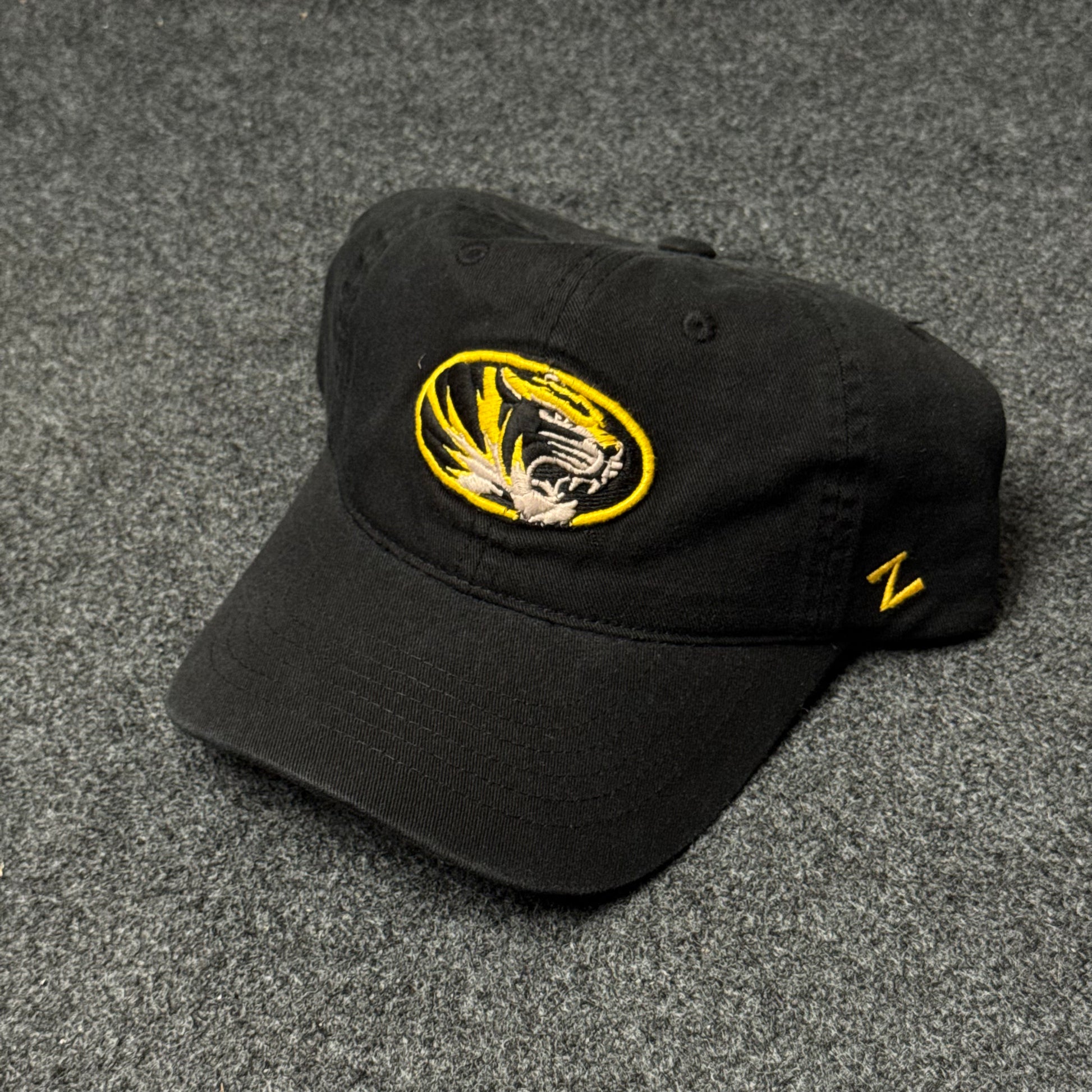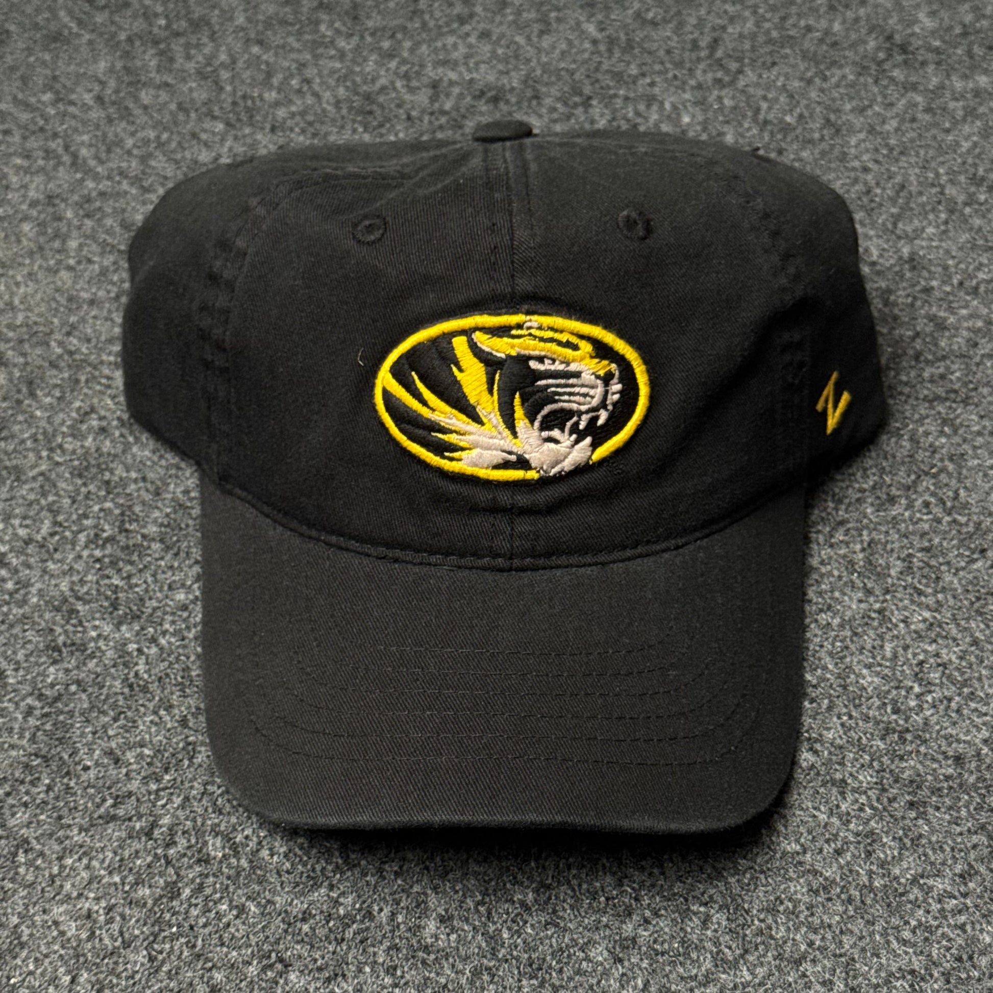 A classic black collegiate cap representing the University of Missouri. The front features the iconic oval "Tiger Head" logo embroidered in gold and white thread. A small gold "Z" (Zephyr) logo is embroidered on the side panel, marking it as authentic collegiate headwear.