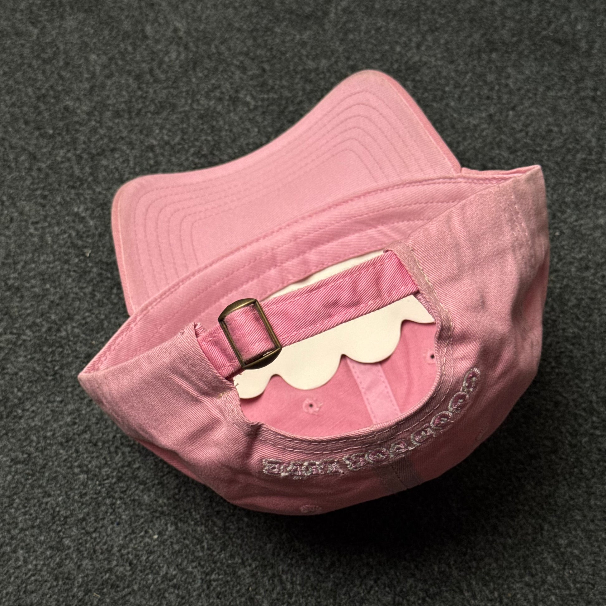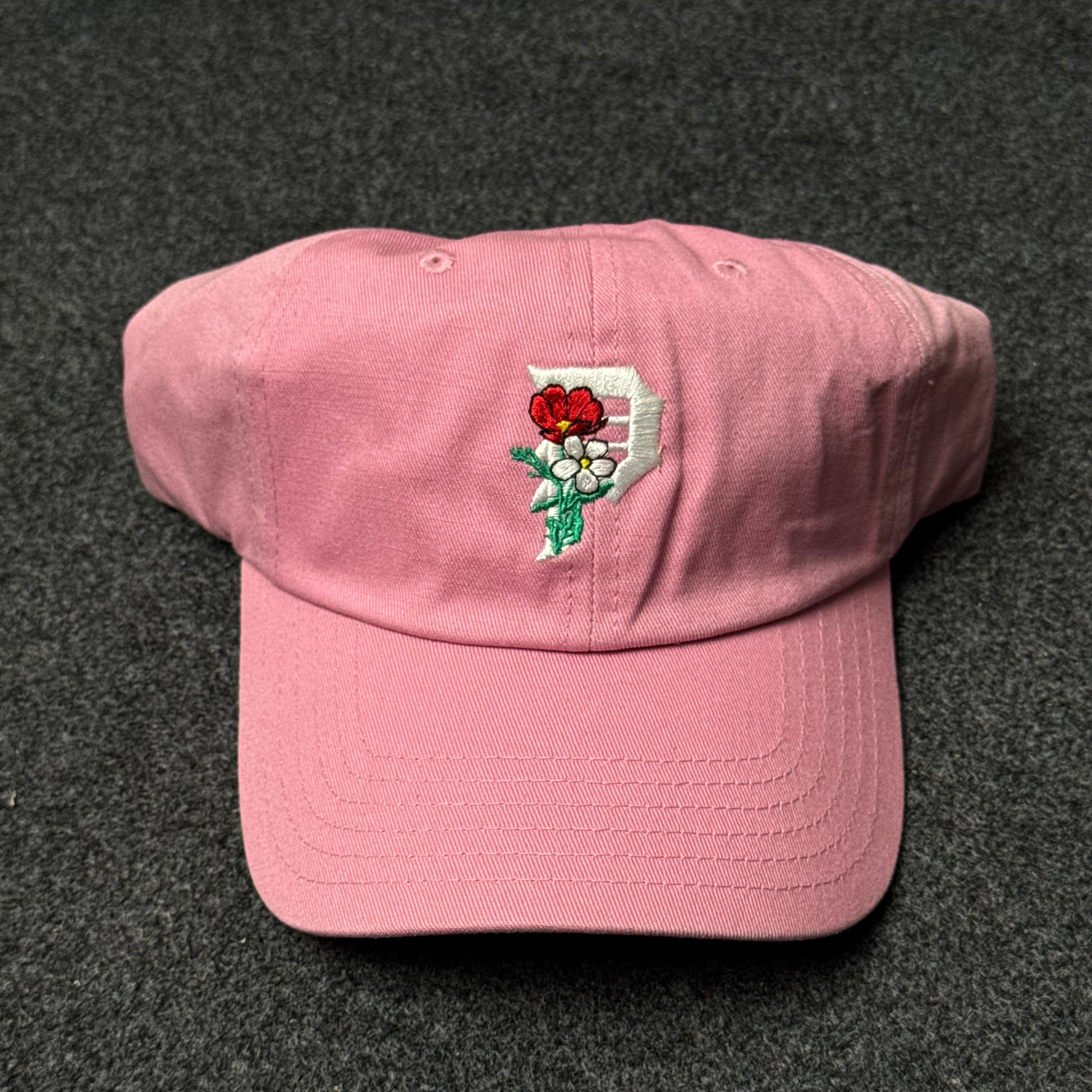 A pastel pink dad hat from the popular streetwear brand, Primitive. The front features their signature "P" logo rendered in a white Old English font, intricately intertwined with embroidered red and white roses.