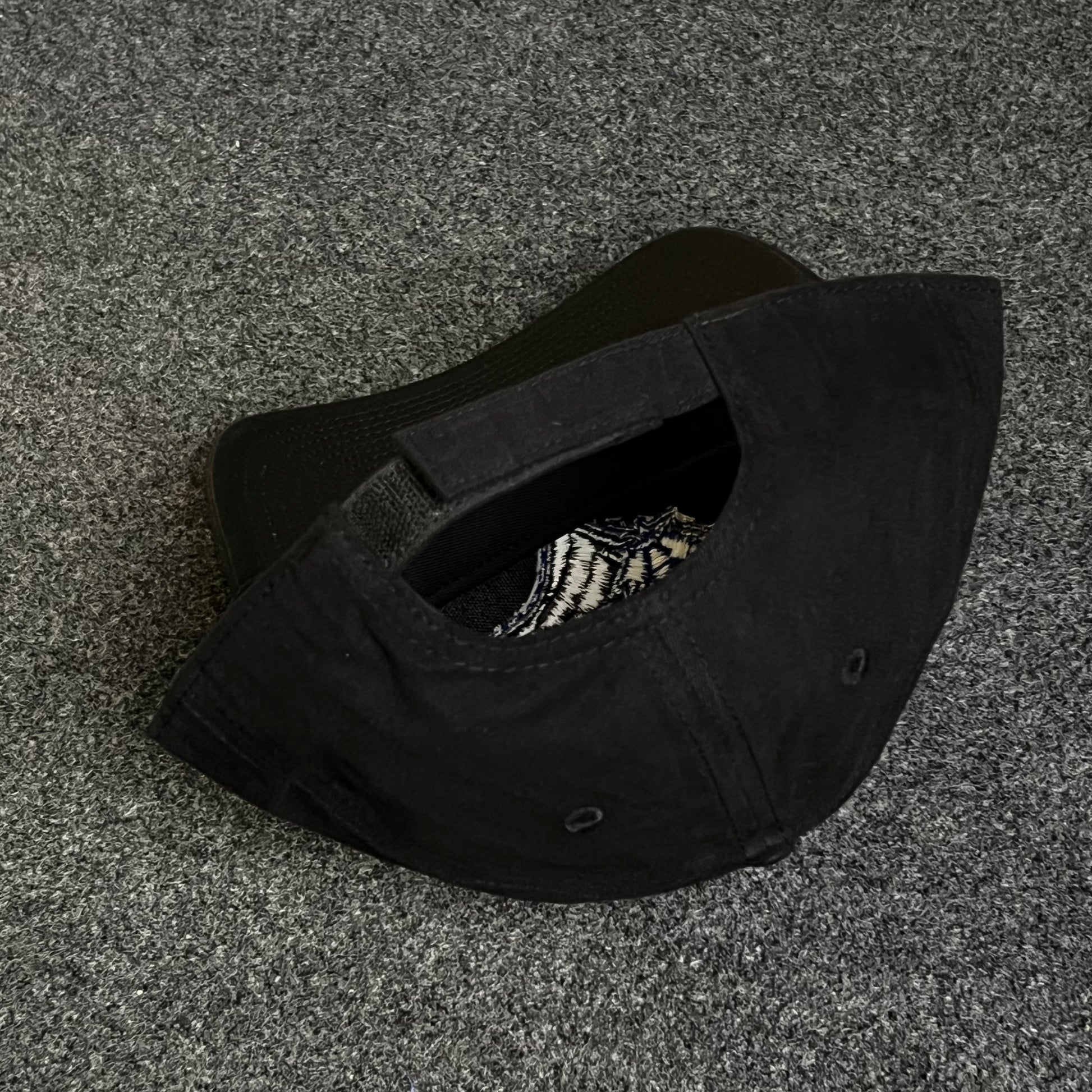 🧢 All-black six-panel crown and pre-curved brim