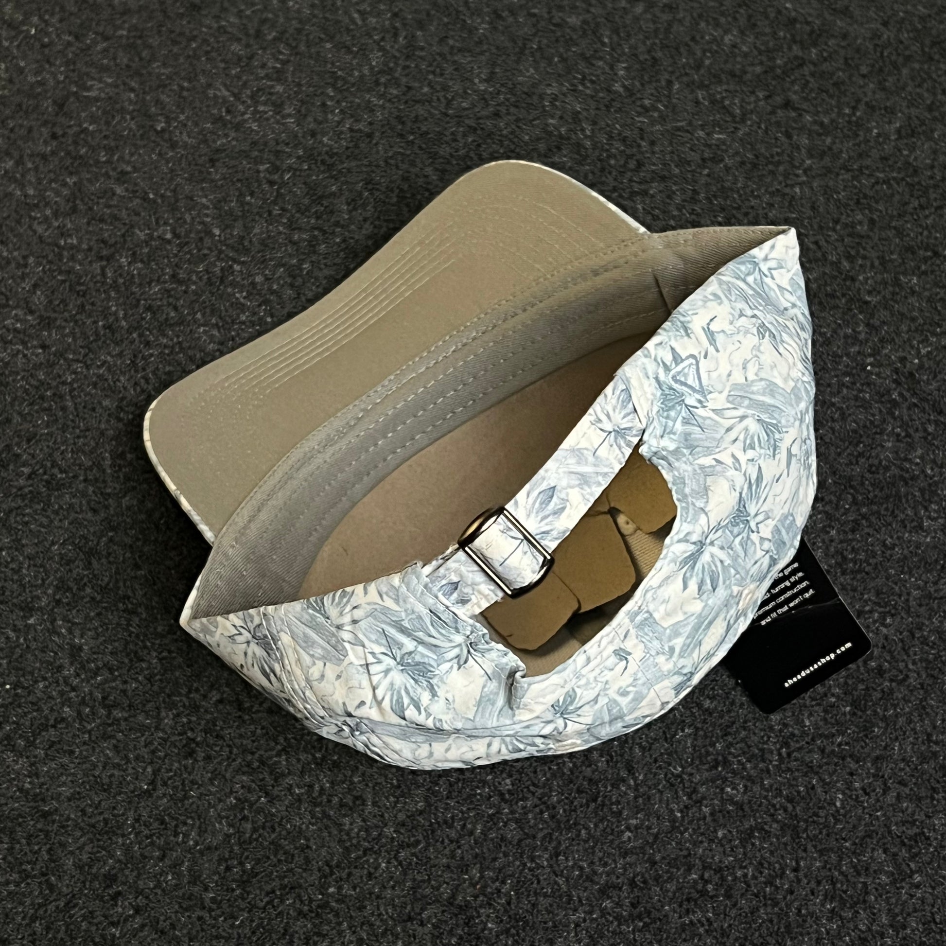 This is featuring a light blue and white leafy palm pattern for a breezy, vacation-ready look. The structured six-panel construction and curved brim offer a secure, comfortable fit, while the all-over print adds a unique, nature-inspired style that’s perfect for beach outings, summer events, or everyday wear. Made from soft, high-quality material, it includes an internal sweatband, a brand tag on the brim, and an adjustable back closure for one-size-fits-most convenience.