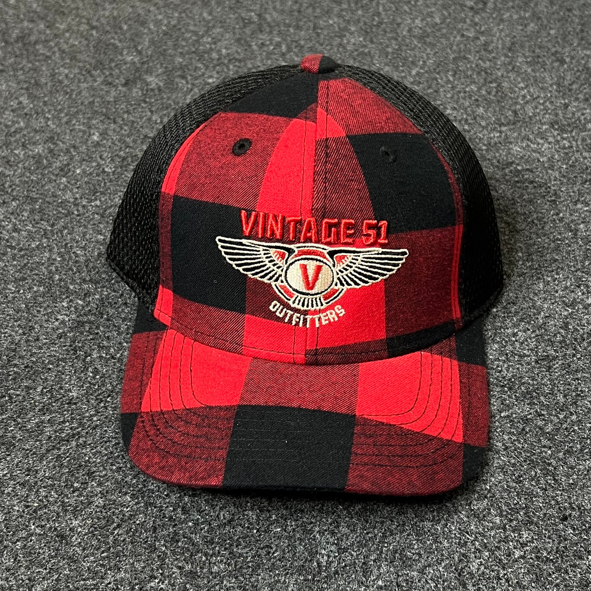 Bring classic style to your wardrobe with the Vintage 51 Plaid Mesh Back Trucker Hat. Featuring a red-and-black buffalo plaid crown, an embroidered Vintage 51 Outfitters patch with wings detail, and a breathable black mesh back, this cap blends retro-inspired design with modern comfort. Perfect for casual wear, outdoor adventures, or vintage enthusiasts.