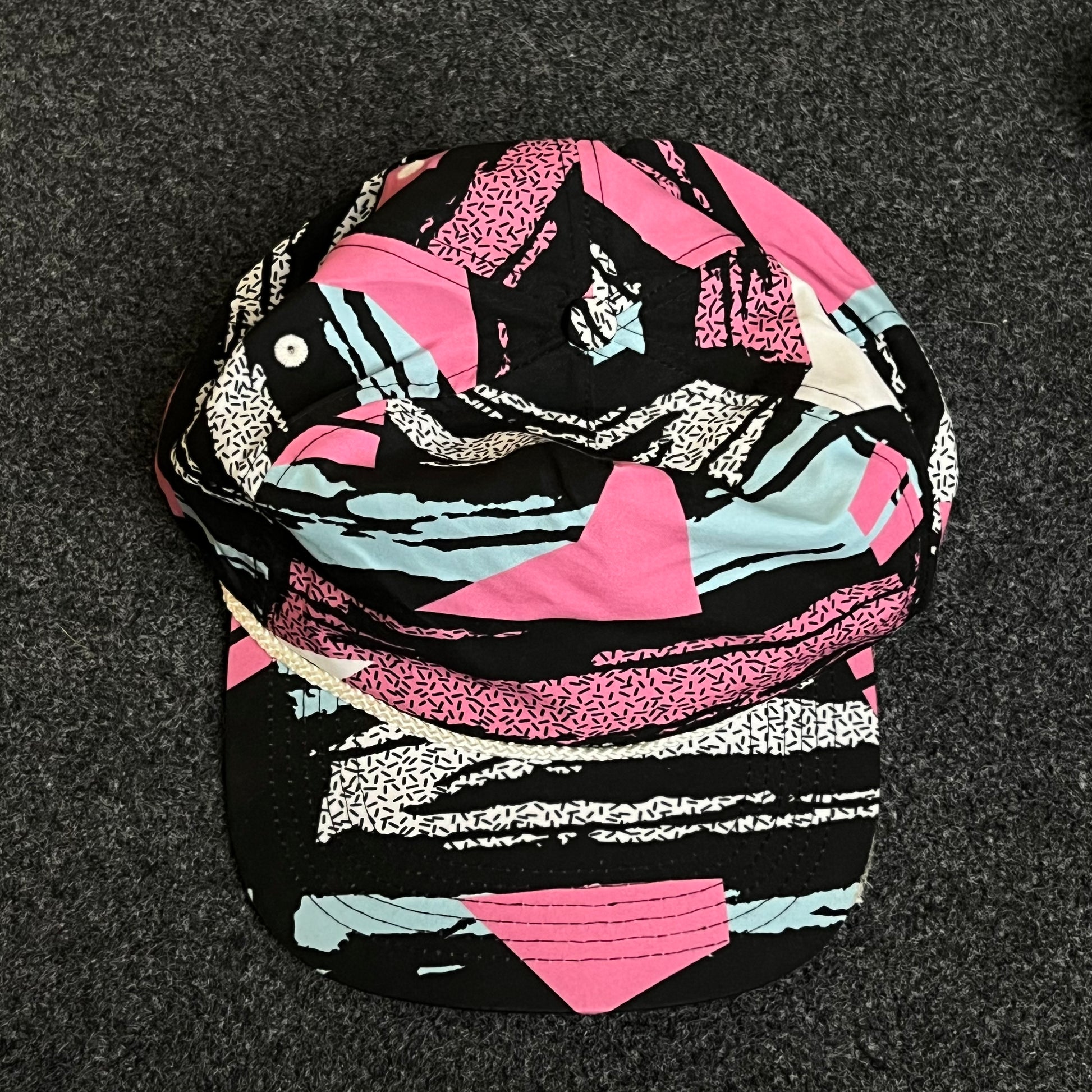 The image shows an unstructured cap with a lively abstract print in black, white, pink, and light blue. With no stiff inner panel, this cap’s crown drapes in a relaxed, casual way, giving it a comfortable, easygoing fit. The artwork consists of blocks, stripes, and textured lines, creating a dynamic statement piece.