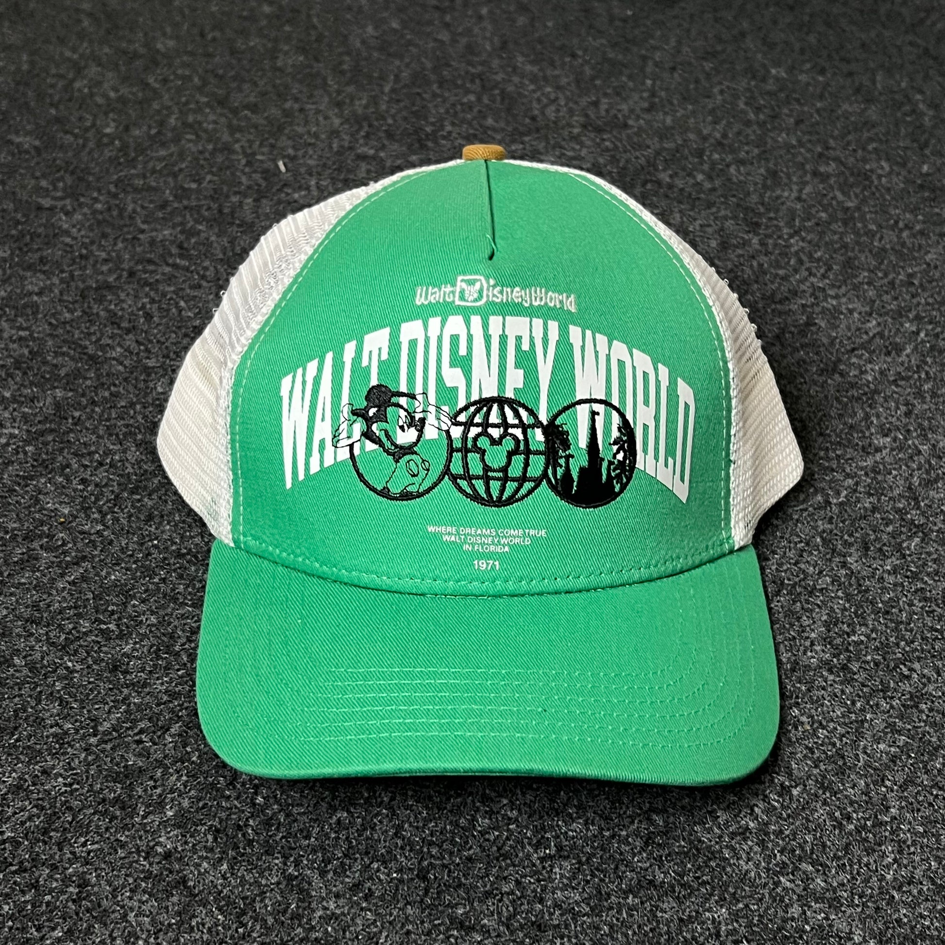 Celebrate the magic of Disney with this retro-inspired trucker hat! Featuring bold “Walt Disney World” lettering with iconic park graphics, this hat is perfect for Disney fans who love a nostalgic touch. The green crown and brim paired with a breathable white mesh back make it stylish and comfortable for everyday wear.
